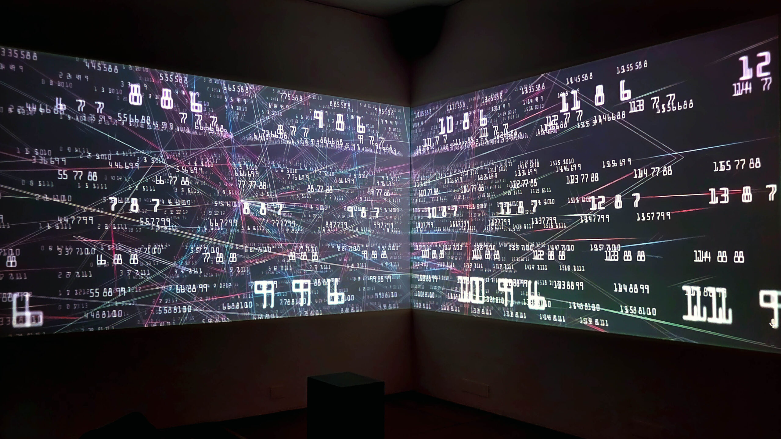In the audiovisual installation confluxus [+][×] corner portals, two stereoscopic 3D projections are utilised to transform the gallery’s 90° corner into a simulated zone of transition and confluence. Dynamic structures — abstract geometries, letters, numbers, statistical and financial charts, data landscapes, flames, smoke, and organic forms — emerge within an illusory expanded spatiality on both sides of the wall planes as elemental flows, flares, and ephemeral spatial formations. Within them, not only Cartesian (rectangular coordinate systems) and non-Euclidean geometries, but also timelines and scales collide, slip, or momentarily coincide.